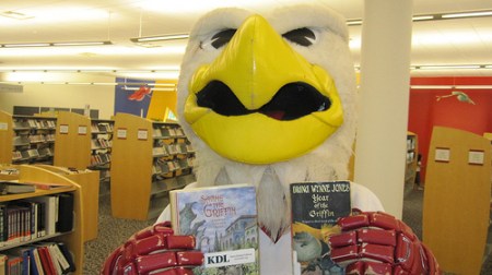 The Grand Rapids Griffin mascot posed with SAVING THE GRIFFIN and Diana Wynne Jones’ YEAR OF THE GRIFFIN. It was pretty fun to see my book next to one by DWJ even though the only real link was the fact that we both had the word “griffin” in the title.